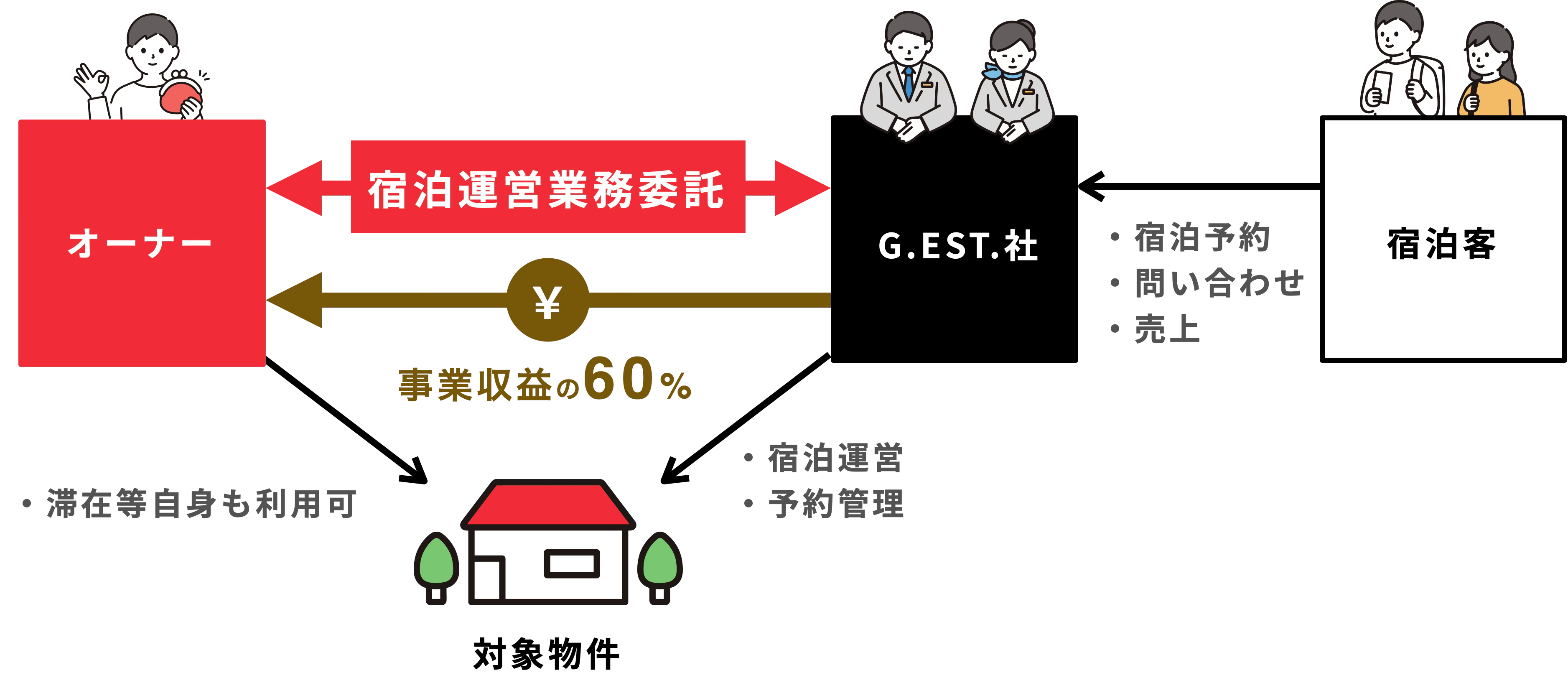 ご購入いただいたオーナーさまは、G.EST.社と宿泊運営業務委託契約を結んでいただきます。 事業収益の60%が支払われます。稼働率45%換算で利回り8.1%(年率・税引き前表面利回り)の想定です。