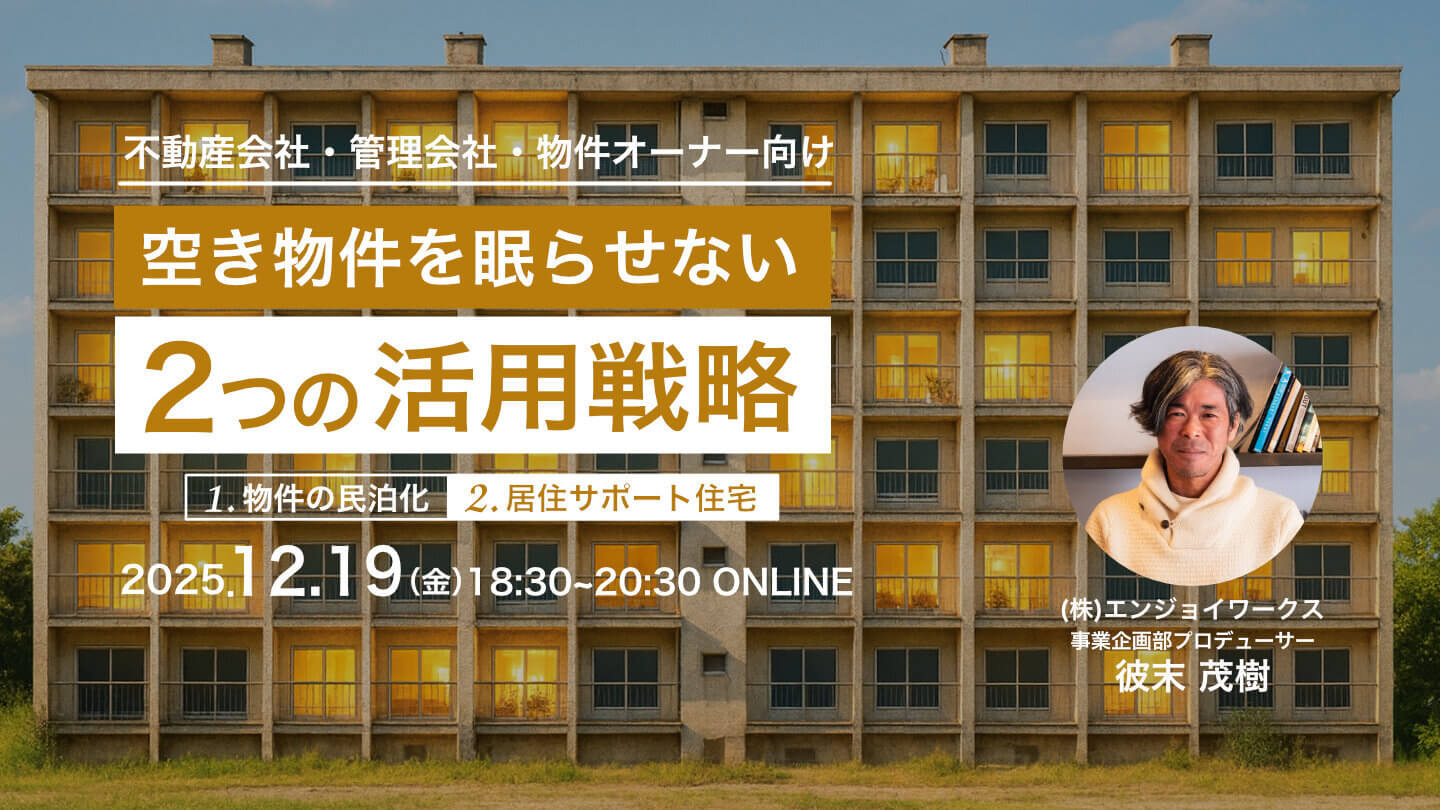 ただこれらに関して、「民泊って実際どれくらい収益があるの?」「民泊での運用に挑戦してみたいけれど、許認可や運営が不安…」「新しい制度ゆえに分からない」「うちの会社でも取り組みが可能か?」といった疑問や不安も少なくなく、実際のノウハウはあまり広まっていません。そこで、こうした質問に答えるため、不動産再生と地域活性のプロであるエンジョイワークスが分かりやすく解説する実践型セミナーを企画しました。題して「今すぐ取り組むべき2つの活用戦略」。空き物件をただ保有する時代は終わり。不動産活用に関わる複数の選択肢から、最適な方法を学んでいただける内容です。