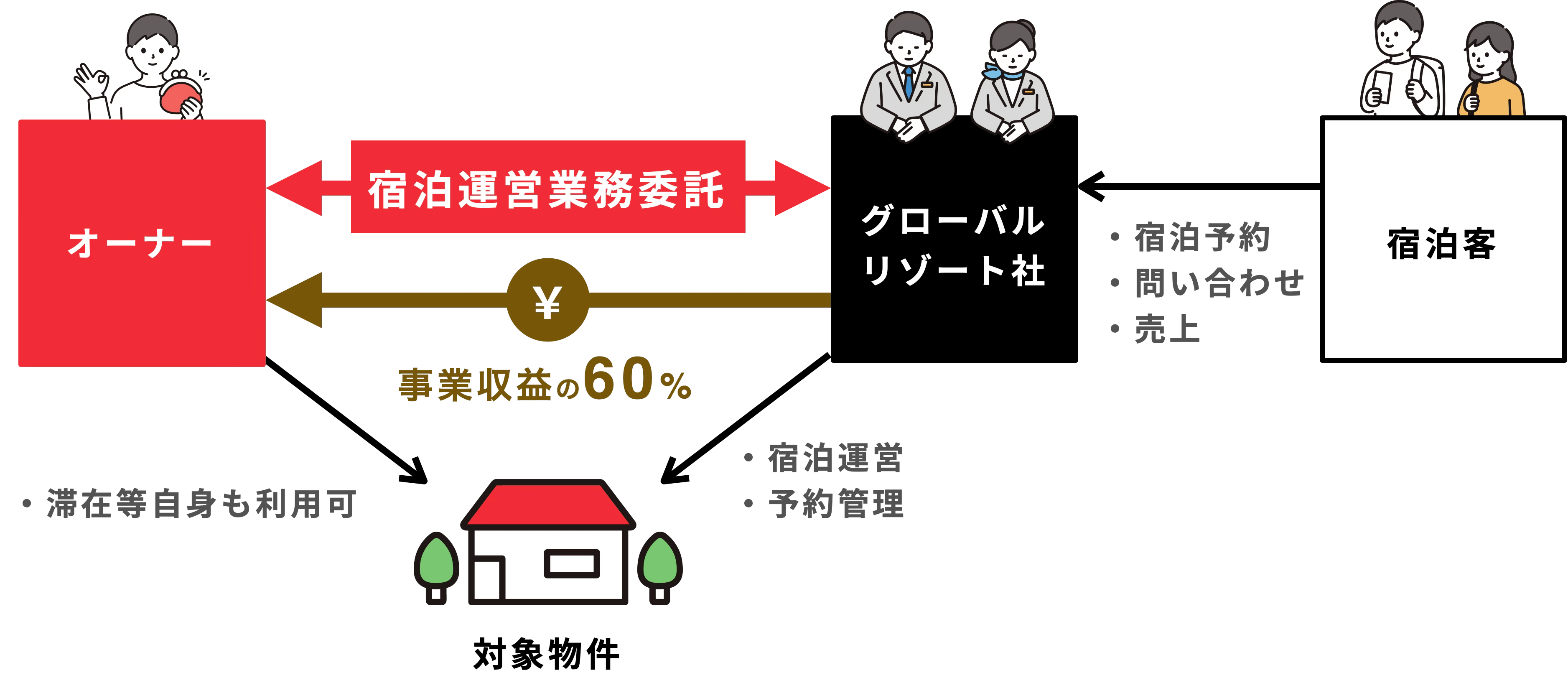 3年目以降は、ご購入いただいたオーナーさまは、グローバルリゾート社と宿泊運営業務委託契約を結んでいただきます。 事業収益の60% が支払われます。稼働率48%換算で利回り8.2%(年率・税引き前表面利回り)の想定です。