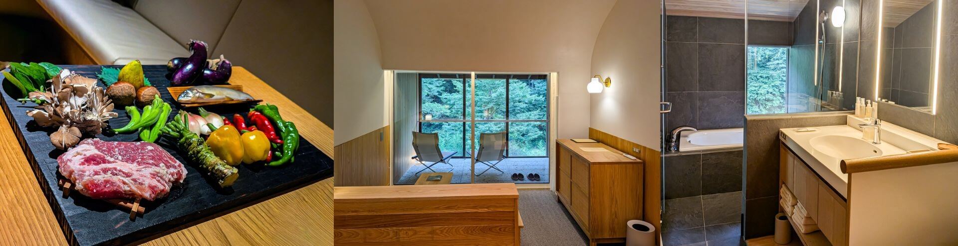 窓からの景色、温かみのある木のしつらえ。そして食卓。「自然の色に浸る」と言う表現がぴったり