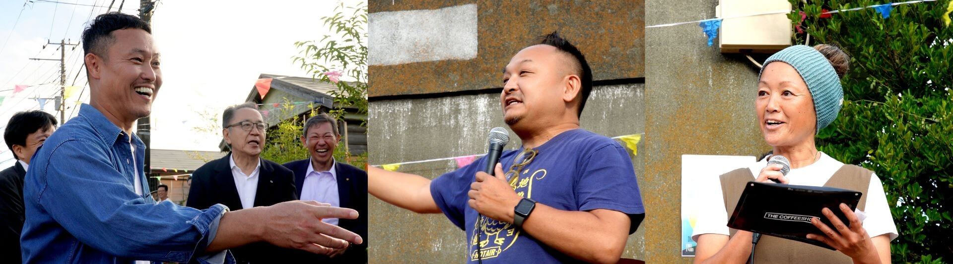月見祭には自治体関係者も来訪。左からエンジョイワークス・福田、上地市長、加藤眞道・市議会議長、セレモニー挨拶でブルースタジオ・大島芳彦さん、入居者代表として萩原明子さん(THE COFFEESHOP)