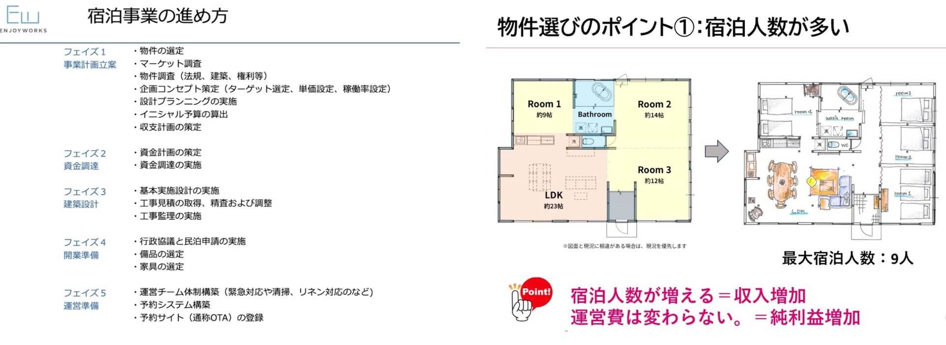空き家活用や滞在の新しい形を模索するエンジョイワークスは、10月にオンライン開催した「不動産再生から始める民泊投資セミナー 〜空き家×民泊で広がる新しい不動産活用〜」で、この課題に向き合いました。セミナーではまず、「空き家と民泊の市場予測。物件選びのポイント」と題して、「民泊需要」の予測や空き家活用の可能性を解説。続いて、静岡県掛川市を拠点とする不動産Mickの馬渕健さんが、民泊に適した物件選びのポイントを深掘りしてくれました。宿泊人数を増やせる間取り、初期投資額、長期滞在や体験型の可能性といった「リアル」に参加者も興味深げ。さらに、今年静岡県で民泊事業をはじめたG.EST.(ジーエスト)の牧田実夕さん、藤田亮太郎さんが登場し、複数の物件をセルフリノベーションして民泊をスタートさせた「リアルな運営の現場」を語ってくれました。