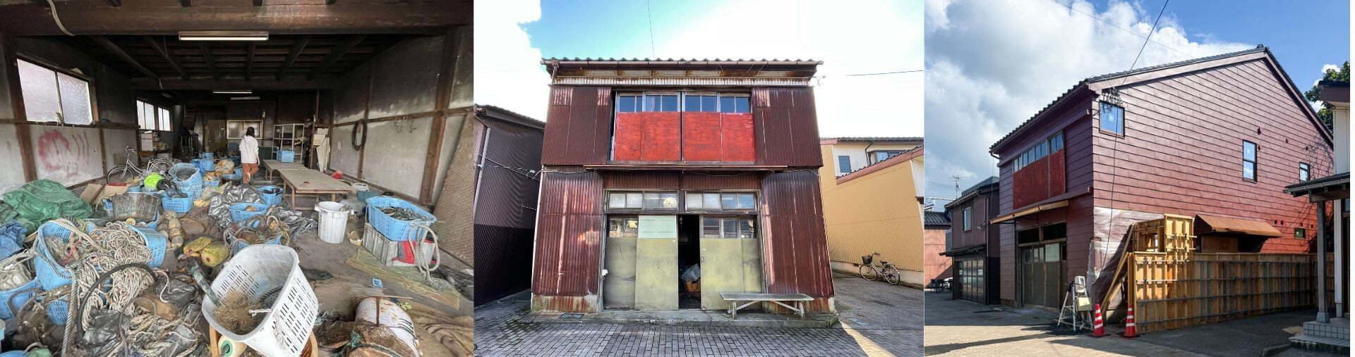 左の写真はリノベ前の様子、まさに漁師小屋。それを丁寧にリノベ(写真右は8月時点の外観)