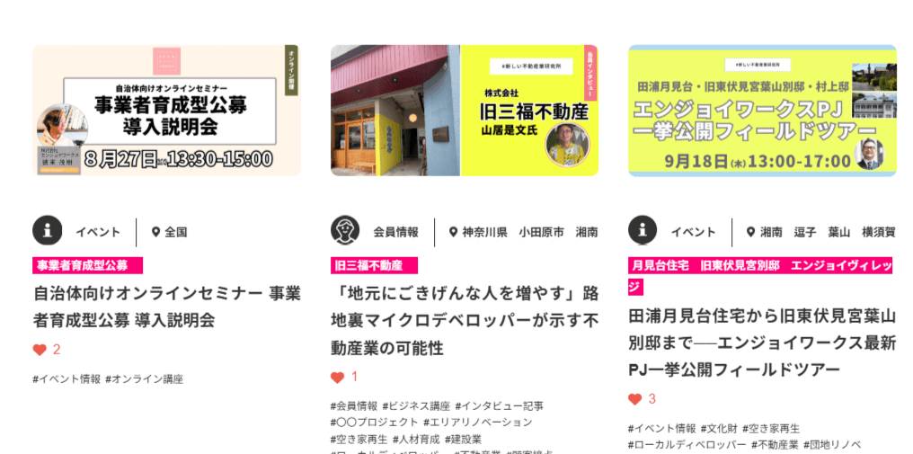 その背景から、エンジョイワークスが2022年に立ち上げたのが「#新しい不動産業研究所(以下、研究所)」です。不動産会社、建築会社、まちづくり会社、デベロッパーなど、立場の異なる事業者が、地域で求められる実務や知見を共有し合うためのプラットフォームになれば、という思いがありました。空き家活用、公共施設の利活用、地域の関係づくりといったテーマは、いま全国各地で共通の課題になっており、いち事業者の思いや努力だけでは解けない事例も増えています。場の再生や運営、コミュニティを育む分譲事業、新規事業のプロデュース、地域拠点の創出…など、従来の取り組み領域を大きく超えて「できること」にチャレンジしてきた私たちならではの視点が原点と言えるかもしれません。