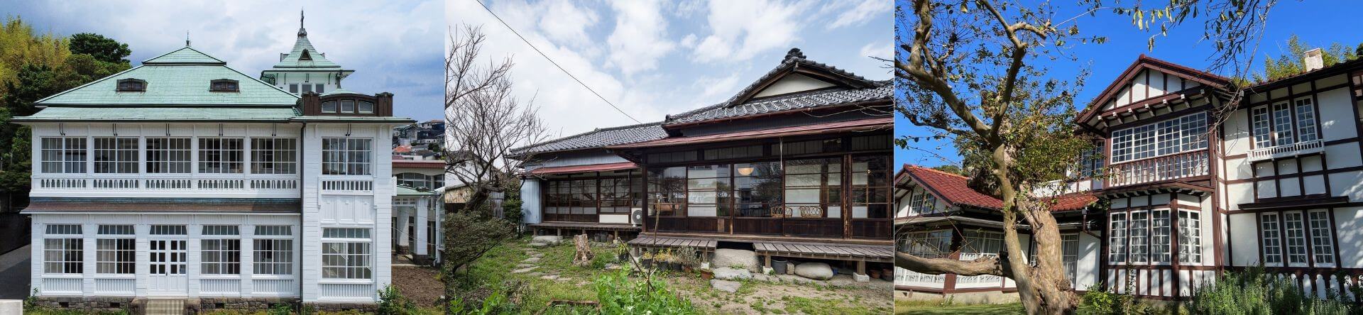 写真左から、エンジョイワークスが運営を手掛ける旧東伏見葉山別邸、平野邸。写真右は、不動産事業者として仲介した国登録有形文化財の旧足立邸