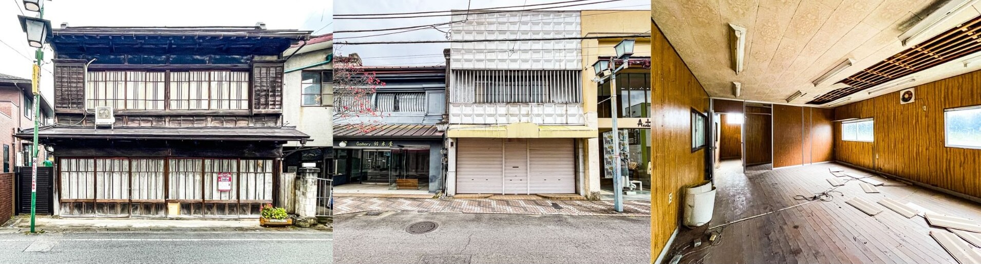 元下駄屋の木造商家建築(写真左)や奥行き50mの「おもしろ」物件など、まちに眠る空き店舗や空き家が対象