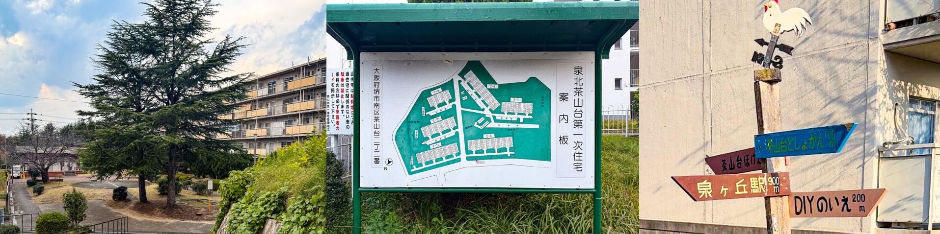 今回の目的地は、大阪南部の堺市南区・泉北ニュータウンにある茶山台団地。1971年に大阪府住宅供給公社によって建設・供給された賃貸住宅団地で、敷地には29棟・約987戸もの住戸が広がっています。5階建ての建物が並ぶこの団地は、最寄り駅(泉北高速鉄道「泉ヶ丘」駅)から歩いて10分ほど。同じエリアにはURの「泉北茶山台団地」もあり、一帯は丘陵地の地形を活かしたゆったりとした環境です。