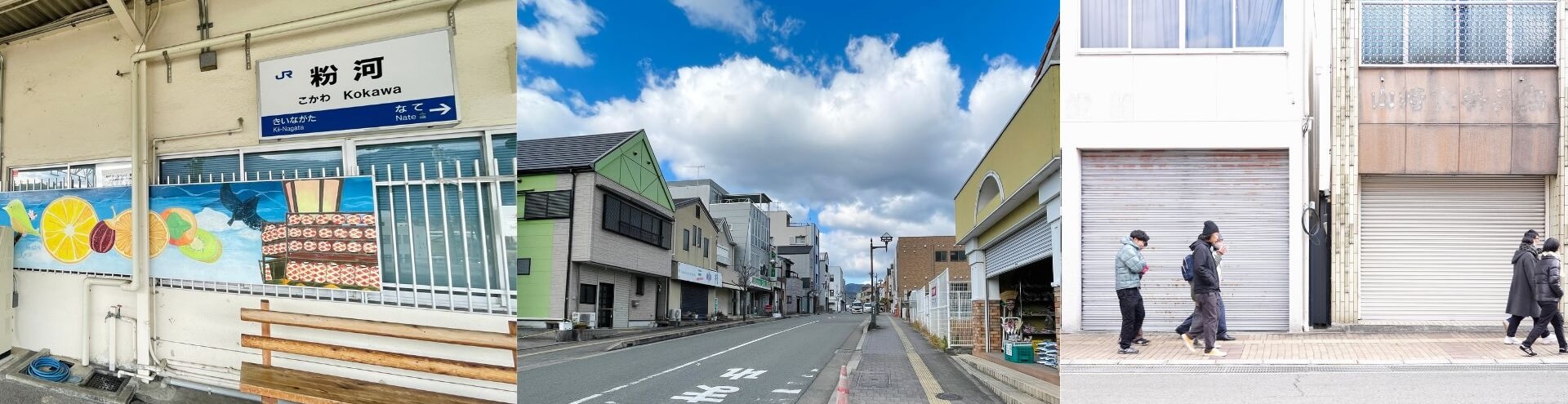 無人の「粉河駅」からとんまか通りを北に向かうと紀の川三笠館に。ですが、この大通りは日中も静かなシャッター街。ここをフルーツで染めたい!そんな野望も