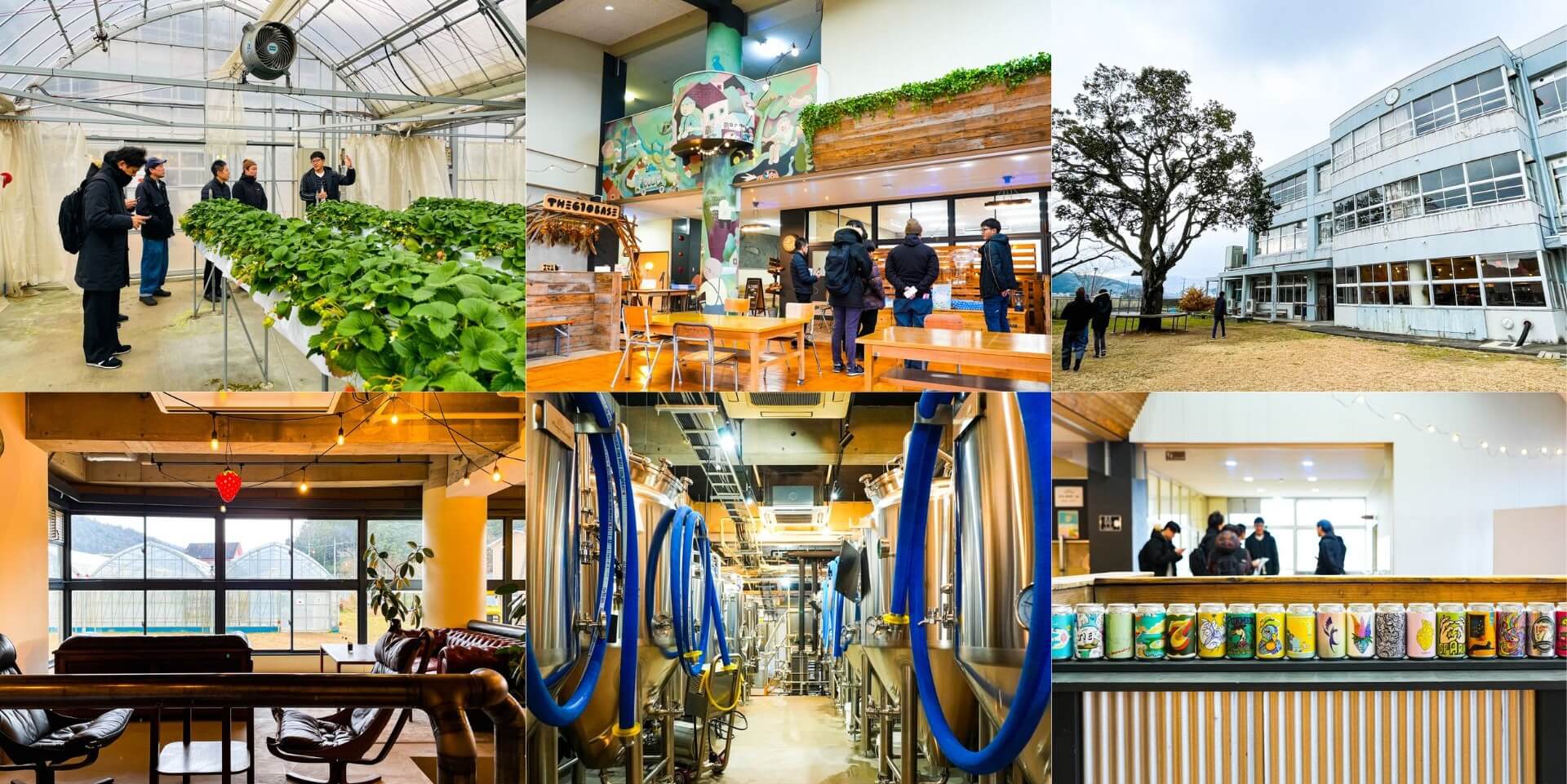 そのうち、私たちが見学したのは3つの施設。最初に訪れたのは、THE 610 BASE。いちご農園とクラフトビール工場です。いちご栽培と体験農業を核に、「地域に人を呼ぶ事業をつくりたい」というアイデアが採用され、活用に至ったそう。山々に囲まれ、田畑が広がる自然豊かな環境の中にある旧中六人部小学校。校舎にはカフェや地域交流の場、校庭にはビニールハウスが。事業者は地元の電気設備資材卸会社で、地域農業の活性化やIT技術を活用した栽培など、さまざまな挑戦が詰まった場所となっていました。小学校の雰囲気を残しながら、今っぽくリノベーションされた空間はおしゃれで写真映えします。カフェでは生クリームたっぷりのいちごパフェやかわいいパッケージのクラフトビールなど、目でも楽しめる工夫が盛りだくさん。人口約700人の町に、多い年には1万人以上が訪れる観光スポットになっているそうです。