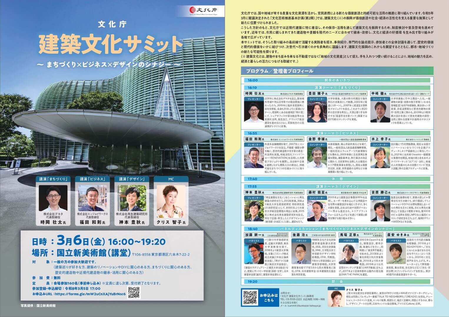その経緯を少し遡ってみましょう。2023年3月に閣議決定された「文化芸術推進基本計画」の中で、「建築文化の振興」が重要施策として新たに位置づけられました。建物やまち並みを「地域の文化資産」として捉え、手を加えながら使い続けることで地域の魅力と経済活力をつなげていくーそういう取り組みを「建築文化」と呼び、国として推進していこうという方針です。建築を「守る」だけでなく「活用」する。国立建築文化センター(仮称)の整備、戦後建築の積極的な文化財登録、リノベーション推進を通じ、社会資産としての価値向上を図っています。そんな流れの中、3月6日に東京の国立新美術館で開催されたのが、「建築文化サミット〜まちづくり×ビジネス×デザインのシナジー〜」。まちづくり・ビジネス・デザイン、それぞれのテーマで実践者が登壇し、建築文化振興の「これから」を議論するイベントです。このサミットの「ビジネス」パートに、弊社代表・福田和則が登壇しました。