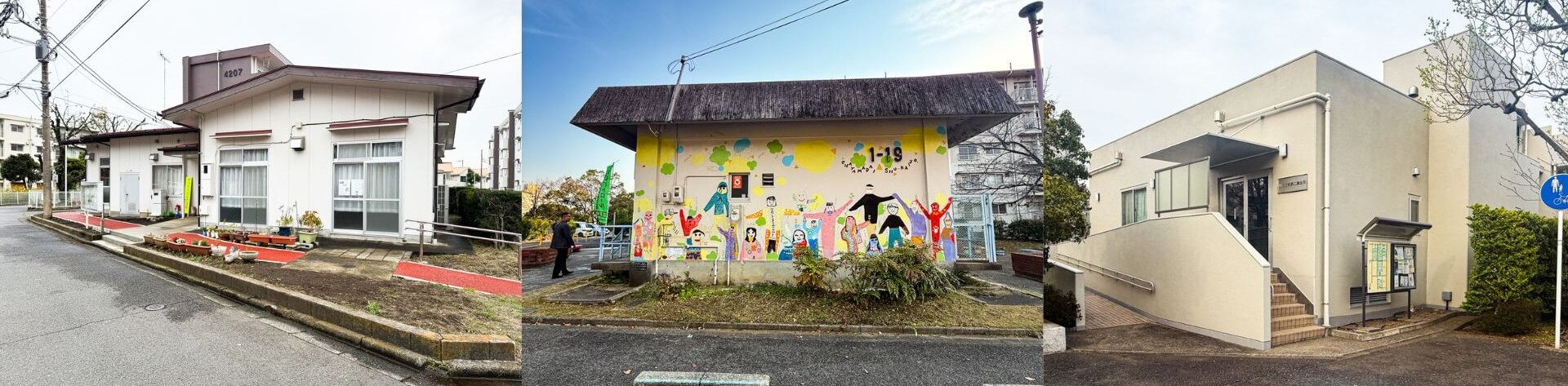 少し大きめの団地群には必ずある「集会棟」。それぞれ佇まいにも特徴あり