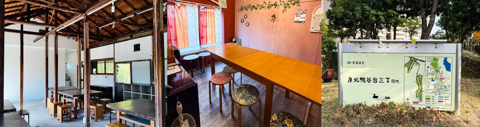写真左は月見台住宅の集会棟の様子。写真中央は茶山台団地。集会所のリノベで図書室やカフェ、DIYスペースなどに