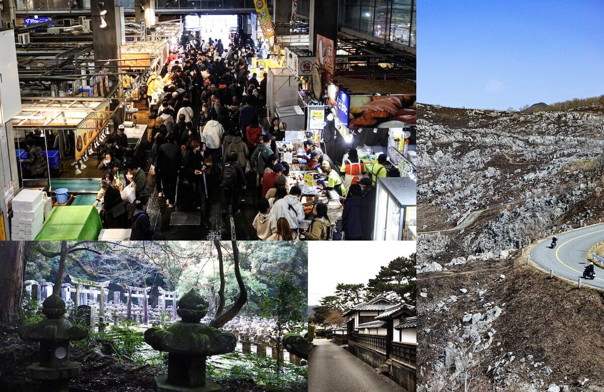 写真左上から「関門の台所」唐戸市場の朝市、東光寺、萩城下町、秋吉台