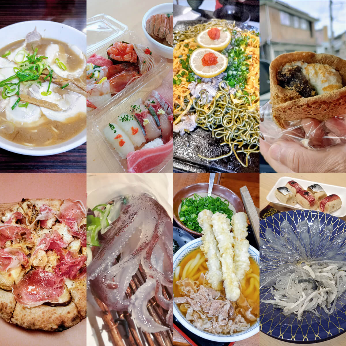 宇部の濃厚豚骨細麺ラーメン「一久」。唐戸市場の新鮮魚介の寿司と魚介汁、ふく刺し。長門湯本「柳屋」の瓦そば。吉冨幸進堂の「黒糖ろおる」。ホテル併設レストラン「TARU」の地産しいたけピッツァ。萩では料亭でイカの活き造り。どんどんのうどん。ほかにもまだまだ…萩市場の穴子刺しとふく寿司。ちくわの千川、赤間醸造の醤油。