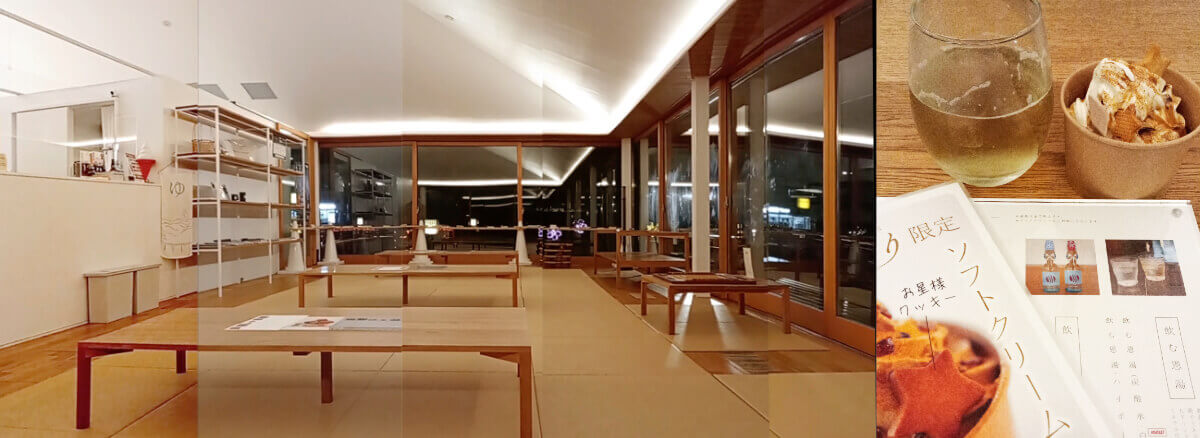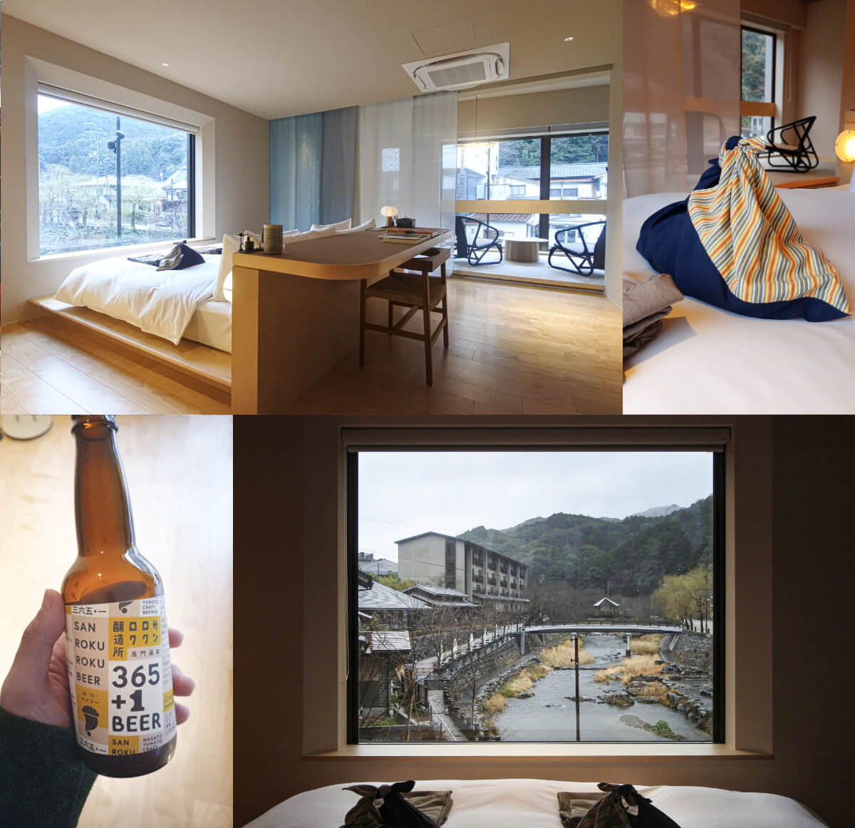 二日目、「SOIL Nagatoyumoto」でのチェックイン時、こんな案内がありました。「お部屋の風呂敷巾着を持っていくと、恩湯に無料で入れます」。なるほど、この巾着が“温泉手形”なのですね。さらに、「冷蔵庫の地ビール『365+1 BEER』とゆずドリンク『長門ゆずきちくん』もどうぞ」と、嬉しいことが続きます。部屋からの眺めもまた、気持ちいい。