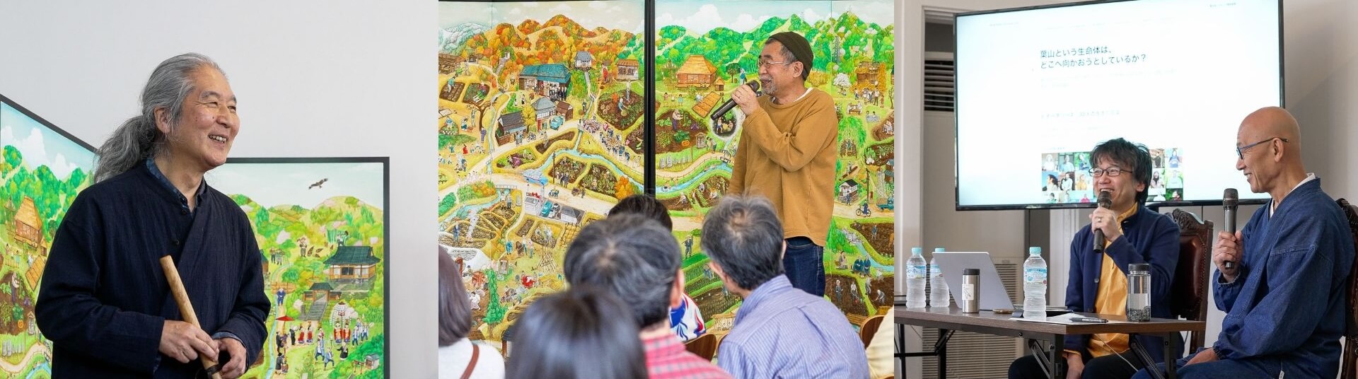 (写真左から)ネイティブフルート奏者の真砂秀朗さん、葉山ふるさと絵屏風継承会の大八木俊也さん、そしてトークで登場した編集者の長沼敬憲さん・僧侶の藤田一照さん